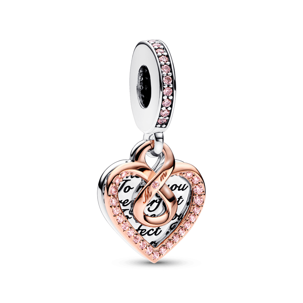 O Charm Pendente Coração e Infinito em Dois Tons Pandora é uma joia que expressa amor eterno e gratidão. Produzido em prata de lei e acabamento banhado em ouro rosê 14K, traz dois corações entrelaçados com o símbolo do infinito ao centro, representando o vínculo inquebrável entre mãe e filho. A palavra “Mum” (Mamãe) é gravada no detalhe central, destacada por uma pedra rosa cintilante. No verso, a inscrição “To me you are perfect” reforça o carinho e admiração. Um presente inesquecível para o Dia das Mães, símbolo de amor, ternura e afeto sem fim.