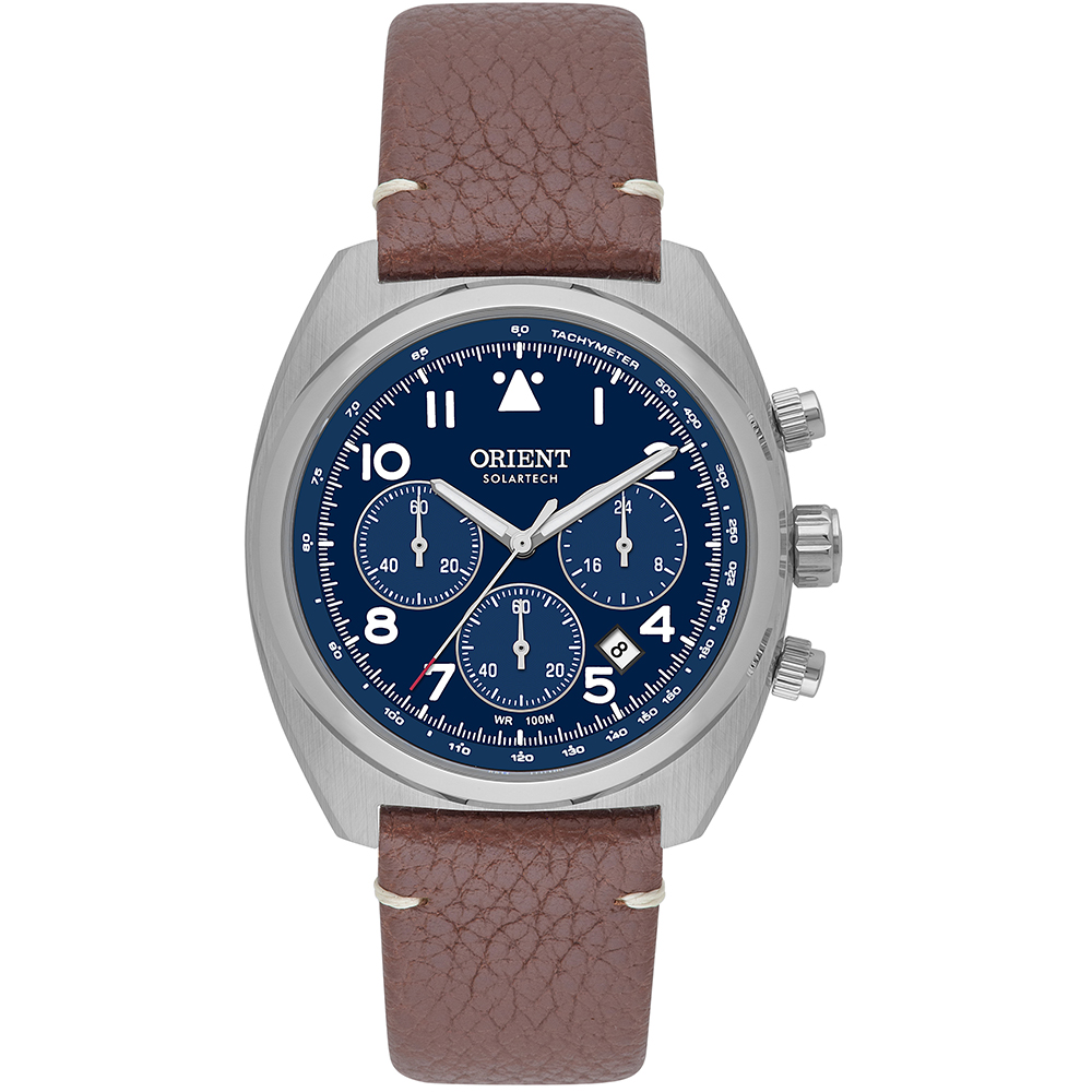 Funções: solartech com autônomia de 6 meses, taquímetro, indicador am/pm, calendário, mostrador em camadas